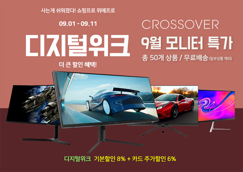 크로스오버는 자사의 인기 게이밍 모니터 50종을 대상으로 위메프 9월 디지털위크 특가전을 실시한다고 밝혔다.