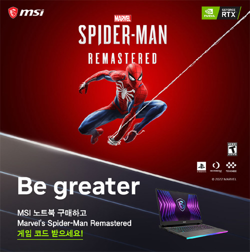 MSI는 RTX 3080/ 3080 Ti 그래픽 탑재 MSI 노트북 구매 고객을 대상으로 '마블 스파이더맨 리마스터(Marvel's Spider-Man Remastered)' 게임 코드 증정 이벤트를 진행한다고 밝혔다.