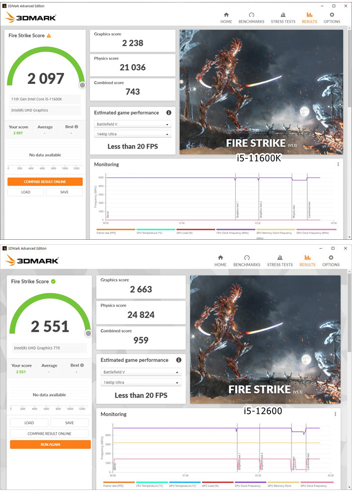 메인스트림급 프로세서인 i5-11600K 와 12600 의 3DMARK 스코어를 비교한 모습으로 전반적인 성능 뿐만 아니라 그래픽 스코어에서도 분명한 차이가 발생하는 것을 확인할 수 있다. 게임을 즐기거나 각종 작업을 할 때 분명한 성능차이를 경험할 수 있을 것이다.