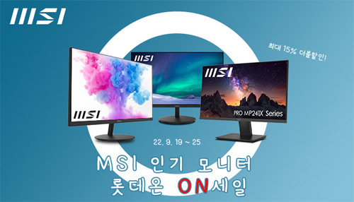 2022년 9월 19일부터 25일까지 진행되는 이번 할인 행사는 MSI 인기 모니터 대상으로 13% 선택쿠폰에 3% 카드 할인을 더해 최대 15% 할인 혜택을 제공한다.