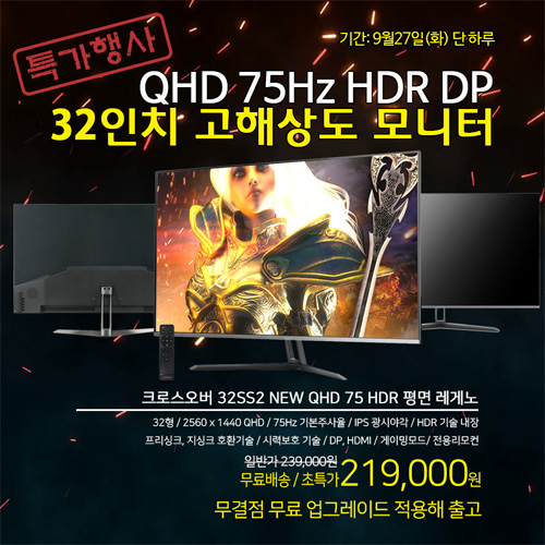 크로스오버는 대표 32인치 모니터인 '32SS2 NEW QHD 75 HDR 평면 레게노’를 대상으로 무결점 무료 업그레이드 초특가 이벤트를 펼친다.