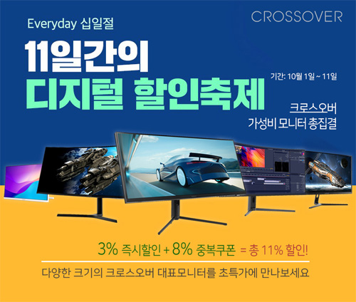 크로스오버는 자사의 인기 게이밍 및 고해상도 모니터 102종을 대상으로 11번가 10월 에브리데이 십일절 이벤트를 진행한다고 밝혔다.