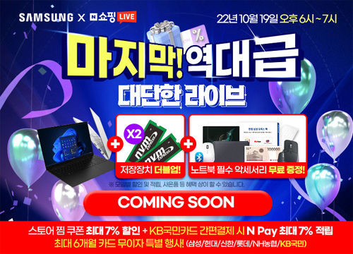 이번 라이브 방송에서는 갤럭시북2 프로 15형(NT950XEE-X71A), 갤럭시북2 프로 13형(NT930XEW-A51A)와 갤럭시북2 프로(NT950XEE-X71AR) 모델들을 7% 스토어찜 할인과 N포인트 7%적립과 함께 10% 할인 쿠폰까지 함께 받아 볼 수 있다고 한다. 추가로 네이버 라이브 방송 중 제품 구매 시 NVMe SSD를 추가로 무료증정 받을 수 있으며, 구매 사은품으로 노트북 액세서리 패키지까지 함께 증정된다고 한다
