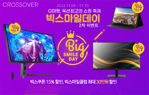 이번 행사 동안 크로스오버의 포터블, 22, 24, 27, 32, 34, 38형 등 다양한 모니터들이 저렴하게 판매된다. 이벤트 상품들은 대표 이미지에 빅스마일데이 스티커가 붙게되며, 이 경우 15%(최대 30만원) / 20%(최대 3만원 할인) 다운로드 쿠폰을 발급받아 사용할 수 있다. 카드할인도 실시하는데, 롯데카드 추가 8% 할인 (15만원 이상 구매시 최대 7만원) 또는 스마일/삼성/KB 7% 할인 (3만원 이상 구매시 최대 5만원)을 선택해서 받을 수 있다. 행사기간은 11월 5일 토요일부터 10일 목요일까지 다양하게 펼쳐지며 행사기간 동안 판매되는 제품들은 전부 무료배송으로 발송된다.
