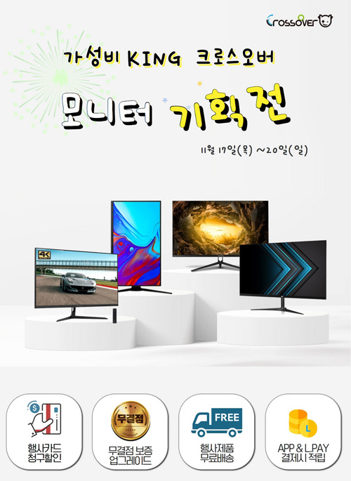 롯데 하이마트에서 11월 17월 목요일부터 20일 일요일까지 진행되는 이번 행사에서 크로스오버존의 다양한 모니터들이 특별한 가격에 판매된다. 행사 내용은 4% 기본할인에 카드사 6~8% 추가할인이 적용된다. 구매제품은 모두 무료 무결점 업그레이드 출고되며, 고객 부담을 덜기 위해 배송비는 무료로 진행된다.