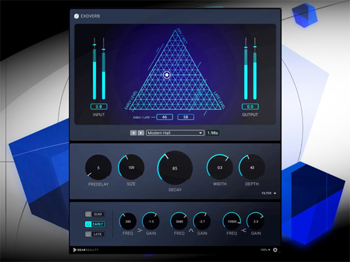 ‘엑소버브’는 음향 효과(Acoustic scene)를 총 50개의 프리셋 형태로 제공하며, 각각 ▲작은 공간의 룸(Room), ▲무대가 있는 큰 공간의 홀(Halls), ▲금속판의 울림으로 생성된 플레이트(Plate), ▲다양한 분위기의 잔향 효과를 나타내는 앰비언스(Ambiences) 등 총 4가지의 유형으로 구성되어 있다. 믹싱 작업을 위한 ‘엑소버브’ 프로그램의 삼각형 패드는 초기 반사음과 후기 잔향의 비율을 X축에 배치하고, 입력 신호(Dry)와 리버브가 적용된 신호(Wet)의 값을 Y축에 배치하여 개별 믹스를 손 쉽게 제어할 수 있다. 또 ‘엑소버브’는 가장 일반적으로 사용되는 5개의 매개 변수를 ‘직접 접근(direct access)’ 방식으로 채택해 하위 메뉴를 탐색할 필요가 없는 편리한 작업 환경을 제공한다.