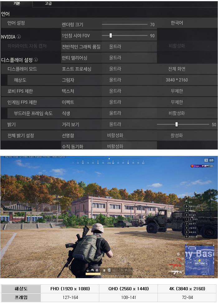 배틀그라운드를 울트라 옵션에서 플레이 해 보았는데 FHD와 QHD 에서는 100프레임 이상으로 플레이 할 수 있었으며 4K 해상도에는 약 80 FPS 정도의 성능을 보여주었다. 국민옵션을 사용하거나 옵션을 중간 정도로 낮춰주면 프레임을 충분히 확보할 수 있어 게이밍 모니터를 사용하기에 불편은 없을 것이다.