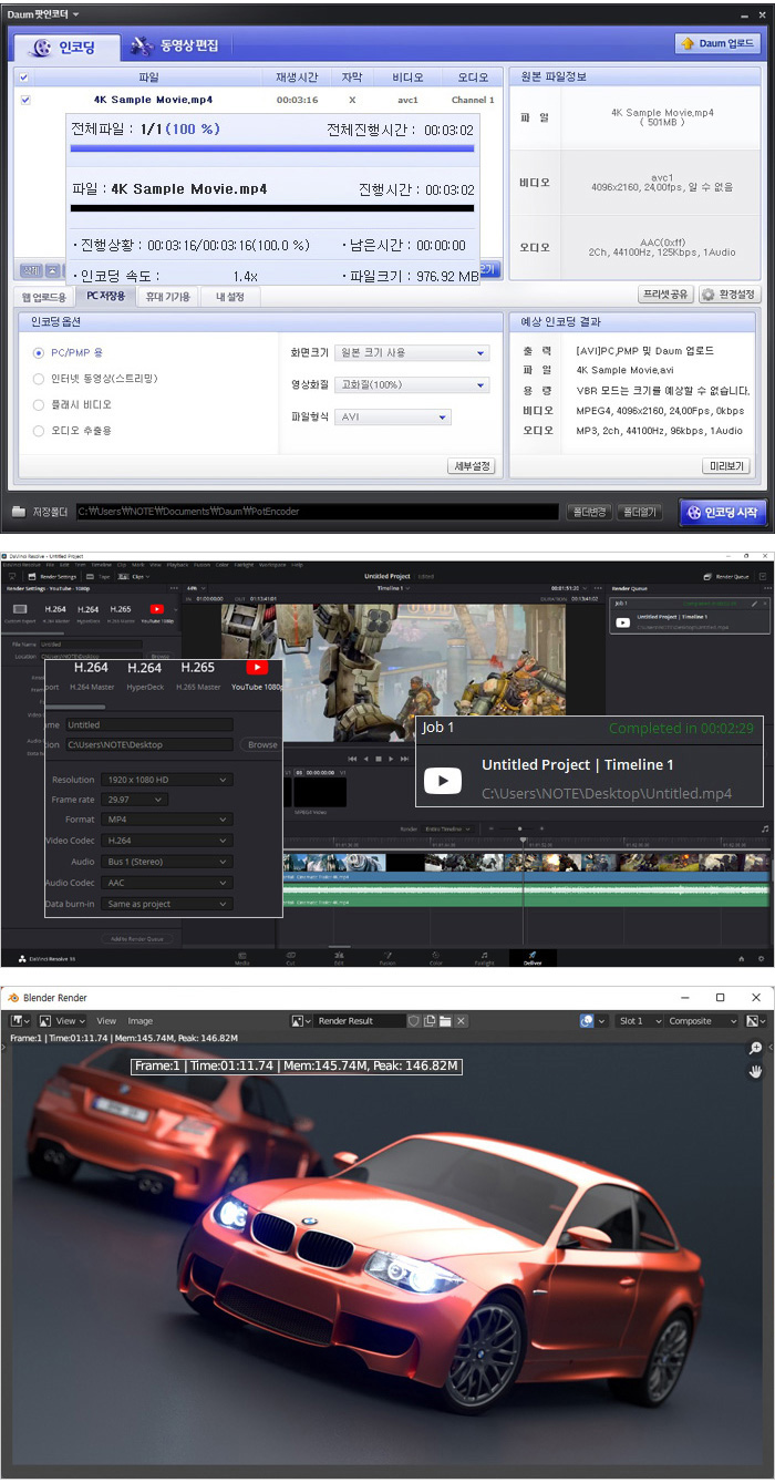 그렇다면 실제 인코딩 및 랜더링 테스트를 진행해 구형 프로세서와 얼마나 큰 성능차를 보이는지 확인해 보도록 하자. 상단의 사진은 동영상 인코딩과 4K 랜더링 테스트를 진행하고 있는 모습으로 인코딩 시간은 3분 02초가 소요 되었고 랜더링 시간은 (다빈치 리졸브를 사용했으며 640MB, 920MB, 990MB 4K 동영상을 단일 동영상으로 랜더링, FHD 해상도에 H.264 비디오 코덱) 2분 29초가 소요되었다. 또한 블랜더 랜더링 테스트에서는 1분 11초가 소요되는 것을 확인할 수 있었다.