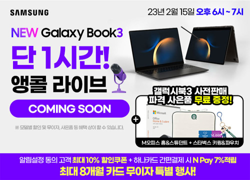 엔씨디지텍은 2월 15일 오후 6시 삼성 갤럭시북2 인기모델 2종과 2023 새롭게 출시한 갤럭시북3 모델들을 대상으로 네이버 쇼핑라이브를 통해 삼성 갤럭시북 블루밍 데이즈 사전판매 라스트 라이브방송을 진행한다.