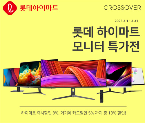 롯데 하이마트에서 3월 1월 수요일부터 31일 금요일까지 진행되는 이번 행사에서 크로스오버의 다양한 모니터들이 특별한 가격에 판매된다. 할인 내역은 행사 상품 전체에 기본 즉시할인 8%가 적용되고, 거기에 카드할인 5%가 추가로 적용돼 총 13%의 높은 할인 혜택을 받을 수 있다. 또한 고객 부담을 덜기 위해 배송비는 무료로 진행된다.