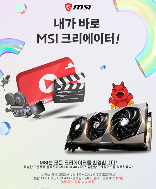 크리에이터를 대상으로 하는 이벤트 기간은 2023년 3월 1일부터 3월 22일까지 진행되며, MSI 홈페이지에서 신청할 수 있다. 경품으로는 추첨을 통해 총 3명에게 MSI 지포스 RTX 4090 슈프림X 트라이프로져3S 그래픽카드를 경품으로 증정한다.
