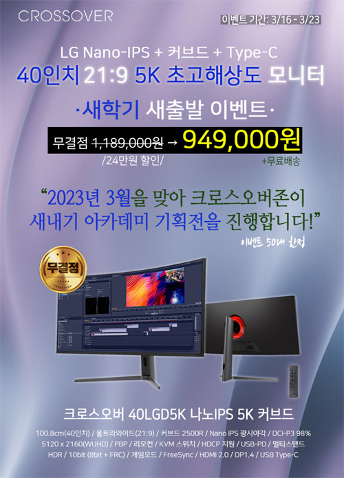 크로스오버가 40형 5K 초고해상도 커브드 모니터 ‘40LGD5K 나노IPS 5K 커브드’를 대상으로 새학기 새출발 초한정판매를 진행한다.