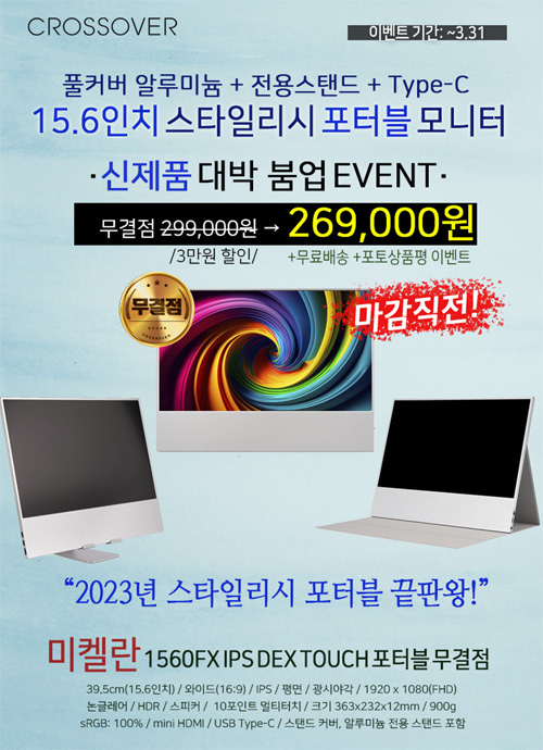 크로스오버가 15.6형 화면을 가진 스타일리시 포터블 모니터 ‘미켈란 1560FX IPS DEX TOUCH 포터블’을 대상으로 초특가 이벤트를 진행한다.
