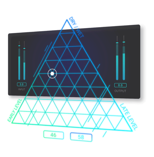 ‘엑소버브 마이크로’는 직관적인 삼각형 패드의 인터페이스를 채택해 누구나 개별 믹스를 손 쉽게 제어할 수 있도록 지원한다. 이 패드는 초기 반사음과 후기 잔향의 비율을 X축에 배치하고, 입력 신호(Dry)와 리버브가 적용된 신호(Wet)의 값을 Y축에 배치하여 모든 믹스에 적절한 양의 리버브를 추가할 수 있게 해준다. 또 3차원의 공간 표현을 위해 신호의 인식 거리를 나타내는 ‘프리 딜레이(Pre-Delay)’와 리버브의 감쇠 시간을 나타내는 ‘디케이(Decay)’ 등의 구성 요소도 직접 접근 방식으로 편리하게 제어할 수 있다.