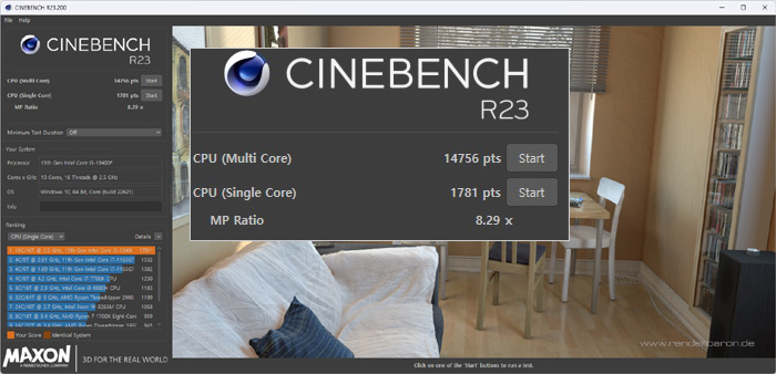13세대 인텔코어 i5-13400F 의 벤치마크 스코어를 확인하고 있는 모습으로 13세대 i7이나 i9과는 분명한 차이를 보인다. 하지만 전작들과 비교하면 비약적인 성능향상이 이루어진 것을 확인할 수 있다.
