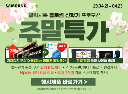 이번 갤럭시북 블로썸 주말 한정 특가 행사는 갤럭시북3 프로 16인치와 14인치 그리고 태블릿형 노트북 모델인 갤럭시북3 360 모델 등을 대상으로 진행되며, 주말행사 특별 할인 혜택과 알림 받기 쿠폰 5% 할인권 증정 그리고 카드 간편 결제 시 N 포인트 추가 적립 및 카드 무이자 할부 혜택과 N Pay 포인트 5% 추가적립까지 함께 제공할 예정이라고 한다. 여기에 주말 특가 행사 중 제품 구매 시 NVMe SSD 추가 무료증정과 노트북 필수 액세서리 한정 패키지와 힐링쉴드 액정 보호 필름등 다양한 사은품까지 함께 증정 받을 수 있다고 한다.