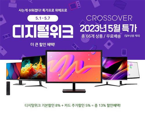 크로스오버는 자사의 인기 게이밍 모니터 66종을 대상으로 위메프 2023년 5월 디지털위크 특가전을 실시한다고 밝혔다.