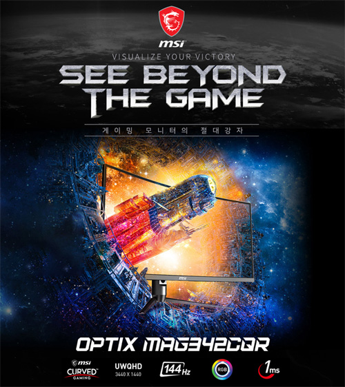 한편 ‘MAG342CQR’ 울트라와이드 게이밍 모니터는 34인치 21:9 UWQHD(3440*1440) 해상도에 커브드 VA 패널을 채택한 제품으로, 144Hz 주사율 및 1ms MPRT 응답속도로 높은 게이밍 퍼포먼스를 제공한다. 또한, 모니터 주사율과 그래픽카드의 프레임을 일치시켜 주는 어댑티브 싱크(G싱크 호환), 게이밍 콘솔에 최적화된 콘솔 모드, 화려하면서 세련된 모니터 LED 점등이 가능한 ‘MSI 미스틱라이트’ 등 다양한 게이밍 기능과 MSI만의 독자기술로 많은 사랑을 받고 있다.