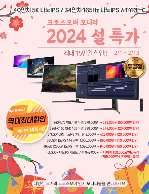 이번 행사동안 크로스오버의 빅포터블, 24, 32, 34, 38, 40, 49형 등 다양한 모니터를 구입하면 최대 150,000원 파격할인을 실시한다. 행사기간은 2월 1일 목요일부터 2월 13일 화요일까지 총 13일간 진행되며, 여기에 포토상품평 이벤트도 진행돼 간단하게 상품평을 작성하고 상품권도 받을 수 있다.