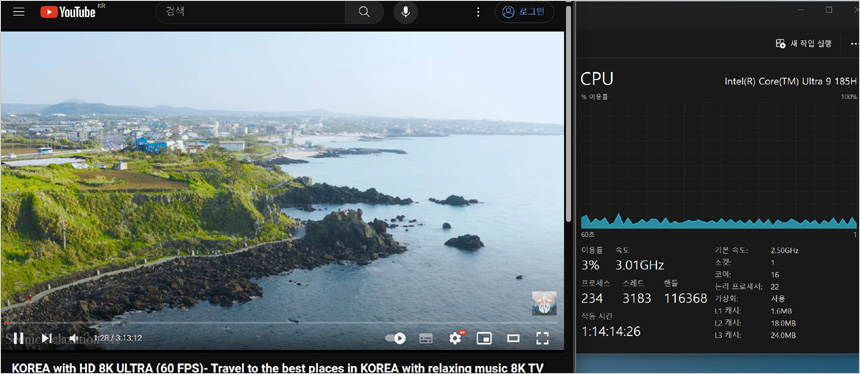 유튜브 고화질 동영상을 이용해 CPU 점유율을 테스트 하고 있는 모습으로 (2160P@60FPS) 3-9% 대의 점유율을 보여 주었으며 인터넷을 실행했을 때 20% 후반까지 점유율이 올라가는 것을 확인할 수 있었다.