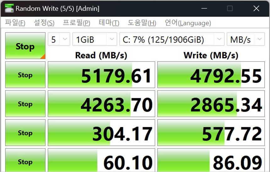 저장장치의 속도를 확인하고 있는 모습으로 PCIe 4.0 NVMe M.2 SSD 가 기본 장착되어 한차원 높은 속도를 즐길 수 있다. 특히 2TB 대용량을 지원해 대용량 데이터를 여유롭게 저장할 수 있다.