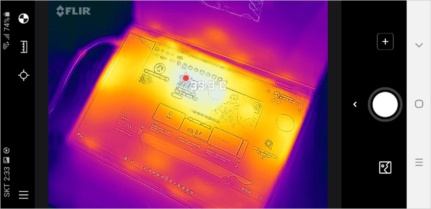 열화상 카메라를 이용해 게임 실행시 열분포를 확인하고 있는 모습으로 칩셋이 설치된 중앙부를 중심으로 열이 퍼져 나가는 것을 확인할 수 있다. 블루투스 키보드를 올려두면 열이 전달되지 않아 스트레스 없이 손을 올려두고 타이핑 할 수 있다.