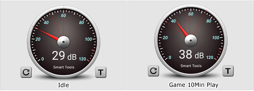 팬소음 테스트를 진행하고 있는 모습으로 캐주얼한 작업시에는 팬소음이 거의 들리지 않았으며 게임을 실행했을 때에는 38dB 까지 팬소음이 커지는 것을 확인할 수 있었다. (게임 상황에 따라 팬속도가 계속 변한다. 테스트 내내 시끄럽다는 느낌은 받지 않았다.)