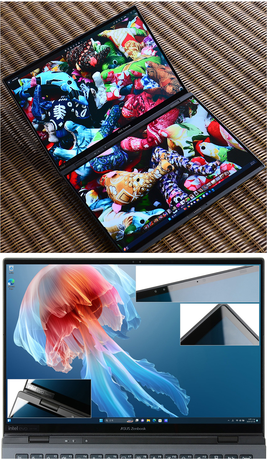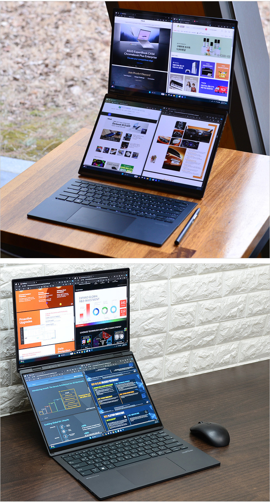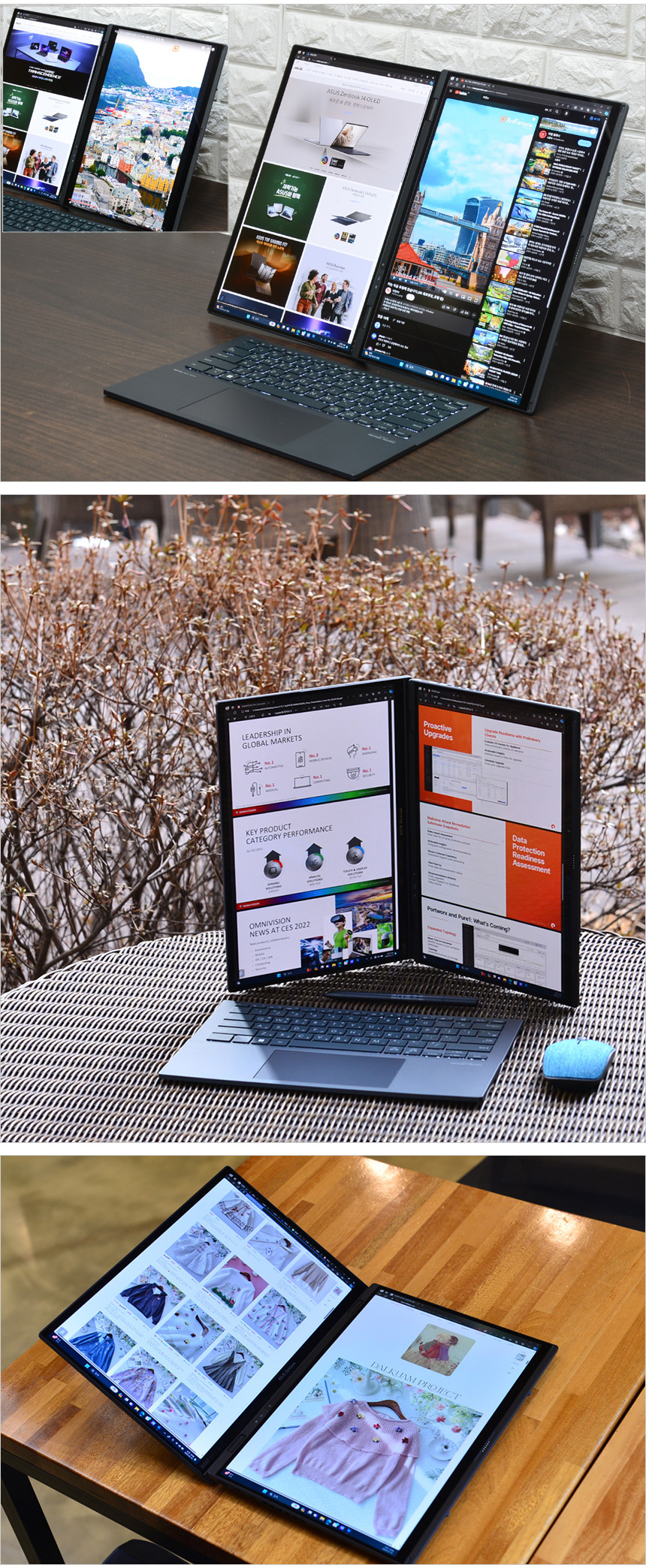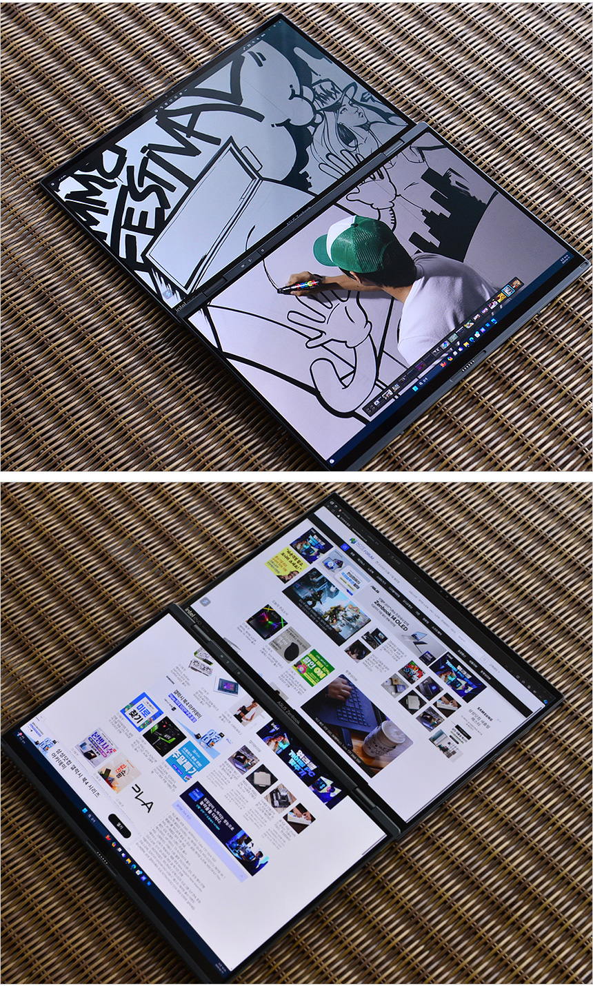 보조 디스플레이의 크기가 작았던 기존 젠북 듀오와 달리 동일 크기의 보조 디스플레이를 장착해 활용성을 극대화 한 노트북이다. 4개의 창을 여유롭게 띄어두고 멀티테스킹을 할 수 있을 뿐만 아니라 하나의 화면으로 사용시 19.8형 대화면 디스플레이로 변신해 글을 편하게 읽을 수 있으며 대화면으로 유튜브 세로영상을 즐길 수 있다. (활용법은 테스트 부분에서 자세히 살펴볼 예정이다.)