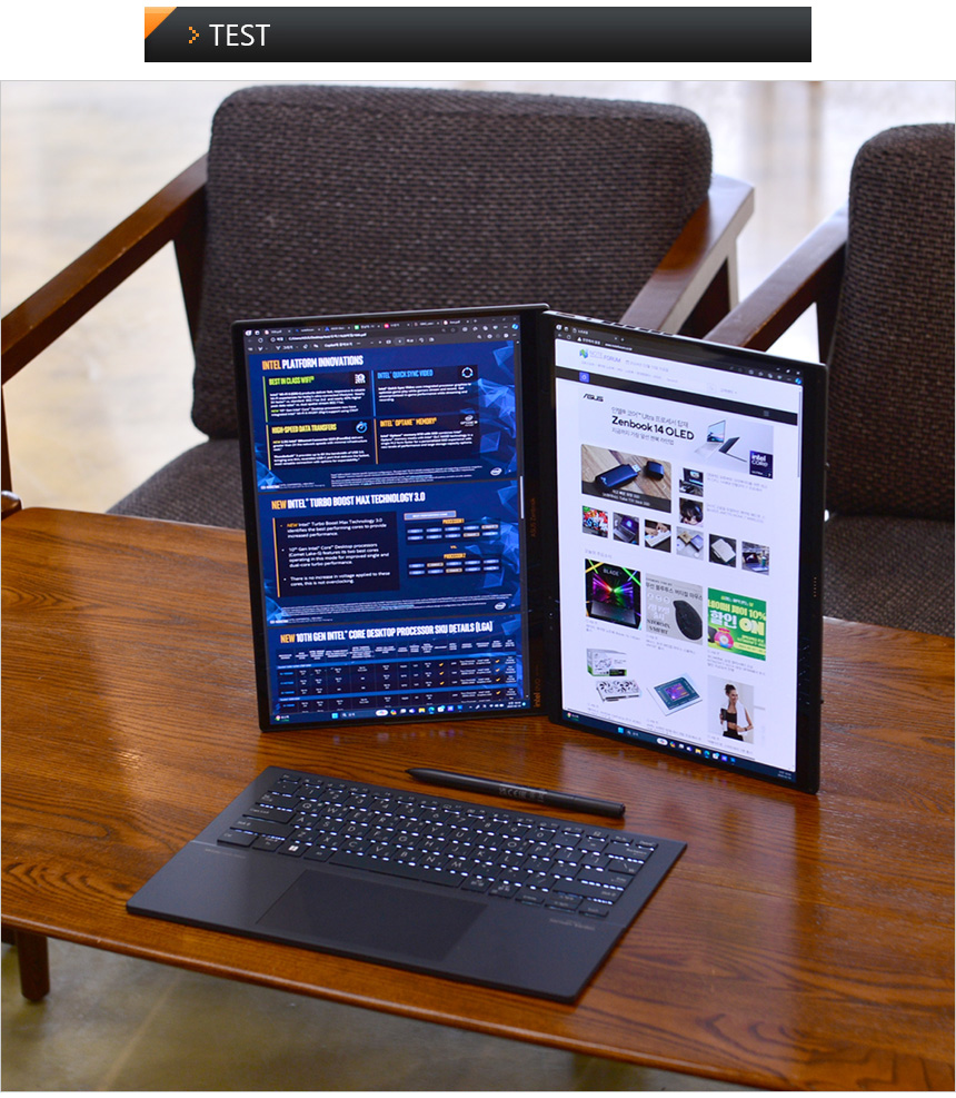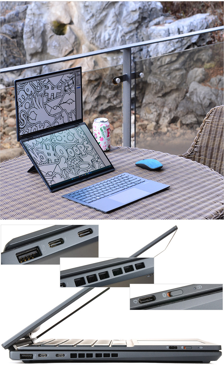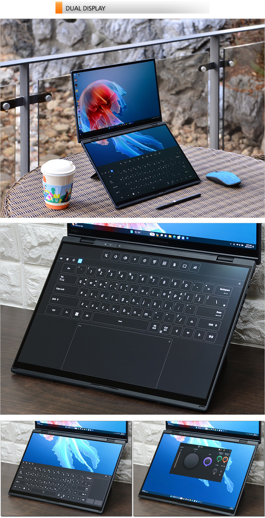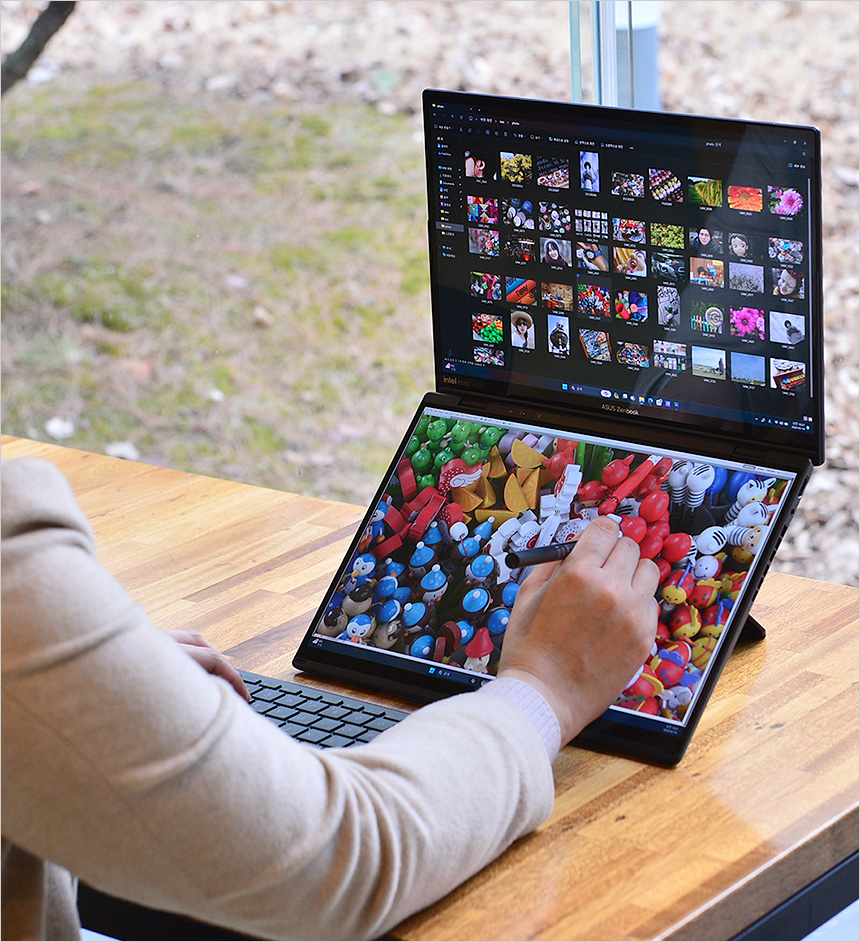 보조 디스플레이의 크기가 작았던 기존 젠북 듀오와 달리 동일 크기의 보조 디스플레이를 장착해 활용성을 극대화 한 노트북이다. 4개의 창을 여유롭게 띄어두고 멀티테스킹을 할 수 있을 뿐만 아니라 하나의 화면으로 사용시 19.8형 대화면 디스플레이로 변신해 글을 편하게 읽을 수 있으며 대화면으로 유튜브 세로영상을 즐길 수 있다. (활용법은 테스트 부분에서 자세히 살펴볼 예정이다.)