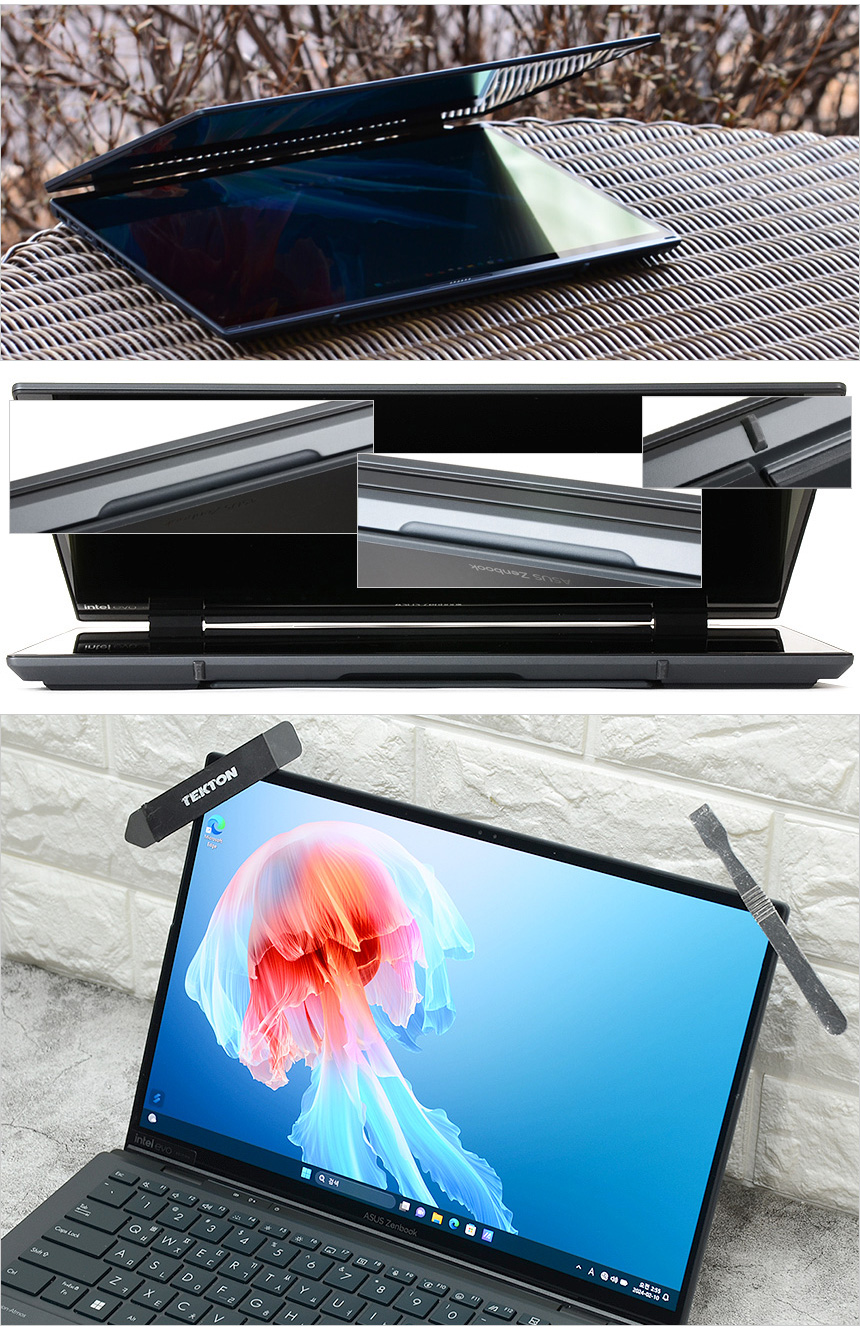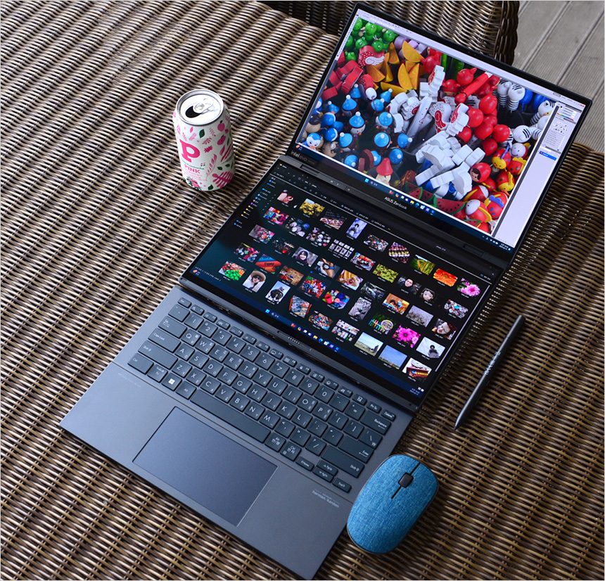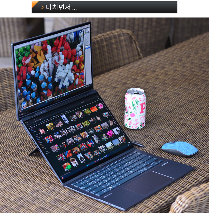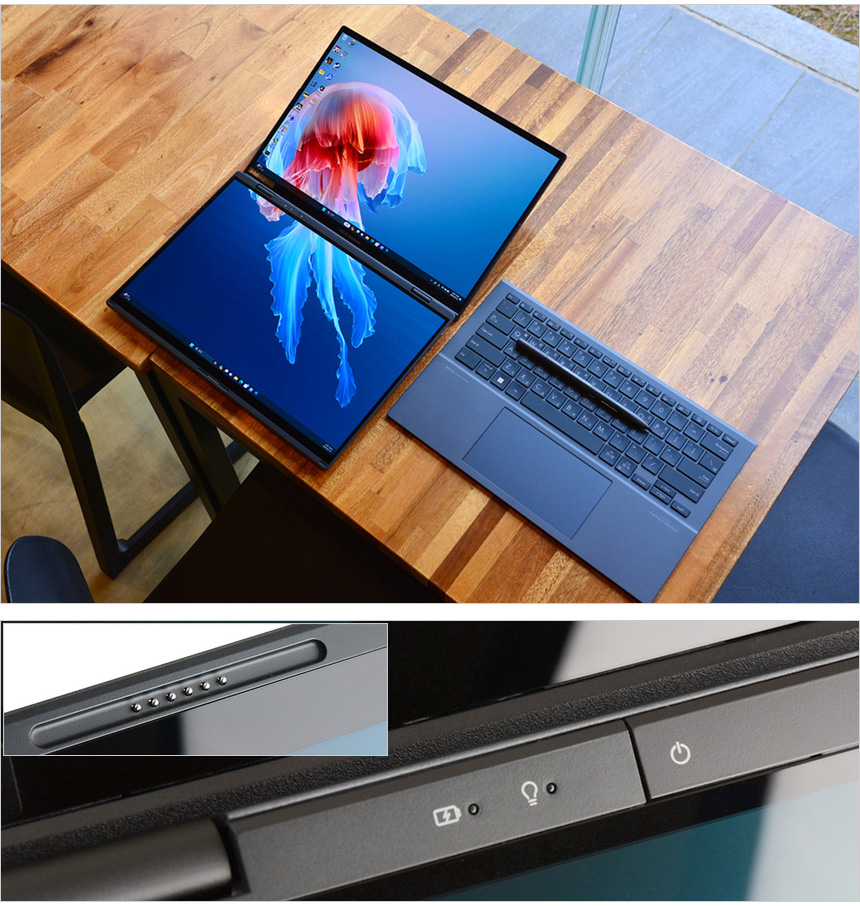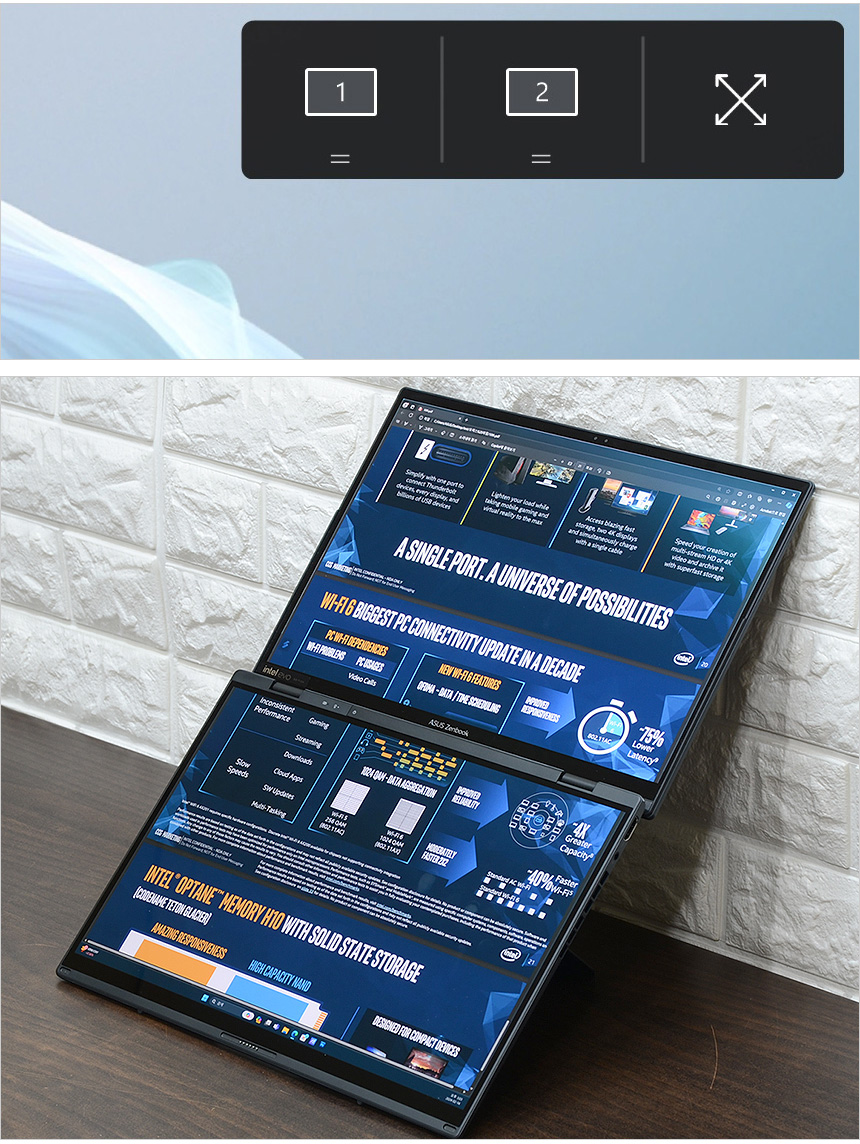 보조 디스플레이의 크기가 작았던 기존 젠북 듀오와 달리 동일 크기의 보조 디스플레이를 장착해 활용성을 극대화 한 노트북이다. 4개의 창을 여유롭게 띄어두고 멀티테스킹을 할 수 있을 뿐만 아니라 하나의 화면으로 사용시 19.8형 대화면 디스플레이로 변신해 글을 편하게 읽을 수 있으며 대화면으로 유튜브 세로영상을 즐길 수 있다. (활용법은 테스트 부분에서 자세히 살펴볼 예정이다.)