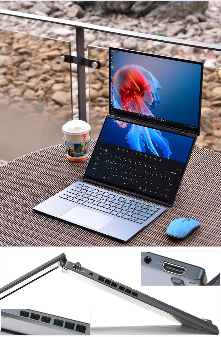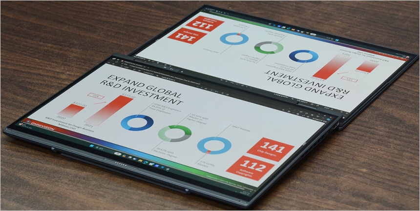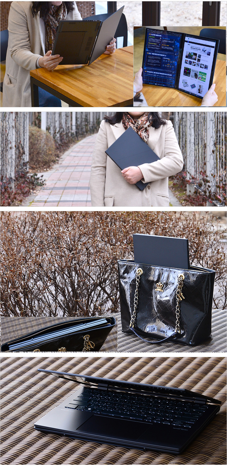 동일한 크기의 디스플레이가 설치된 노트북으로 미팅이나 소규모 프리젠테이션에서도 유용하게 활용할 수 있다. 복제 모드로 화면을 동기화 하고 메인 디스플레이 화면 방향을 변경하면 어느 자리에서나 편하게 화면을 볼 수 있다. 터치를 지원해 누구나 조작할 수 있는점도 매력적인 부분이라 할 수 있다.