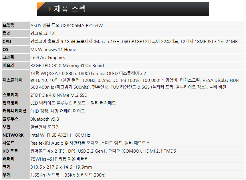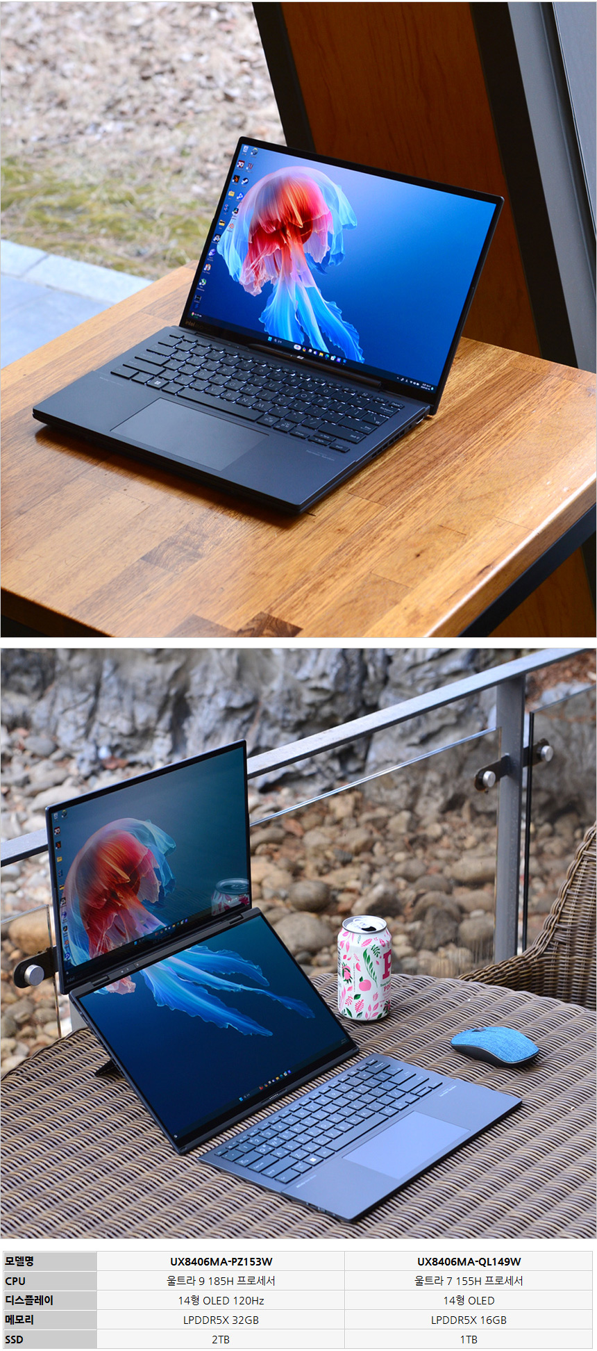 ASUS 젠북 듀오 UX8406MA 시리즈는 2가지 라인업으로 출시된다. 리뷰를 진행하는 UX8406MA-PZ153W는 울트라 9 185H 프로세서에 32GB 메모리와 2TB SSD를 지원하는데 반해 UX8406MA-QL149W 는 울트라 7 155H 프로세서에 16GB 메모리 1TB SSD로 구성된다. 성능과 가격을 고려해 구입하기 바란다. (참고로 약 40만원 정도 UX8406MA-QL149W가 저렴하다.)