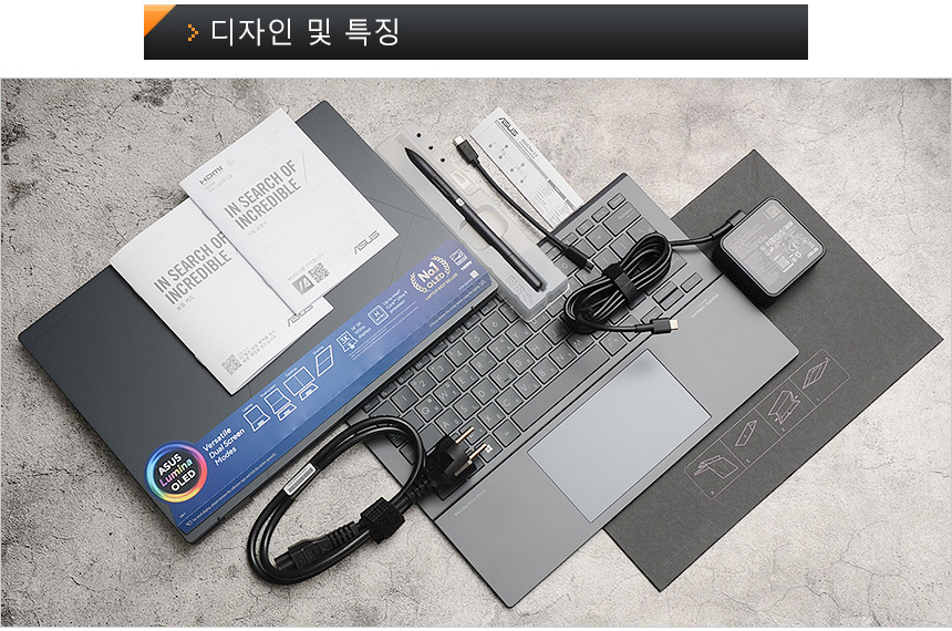 풀KIT 의 모습으로 노트북을 비롯해 65W 전원 어댑터와 전원 케이블, 퀵 매뉴얼과 보증서가 제공되며 드로잉이나 필기등을 위해 4,096 필압의 ASUS 펜 2.0도 지원한다. 뿐만 아니라 종이 스탠드도 지원해 편하게 거치해 사용할 수 있다.