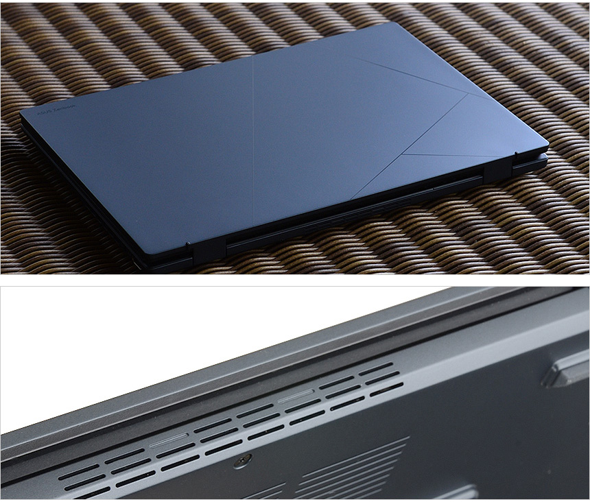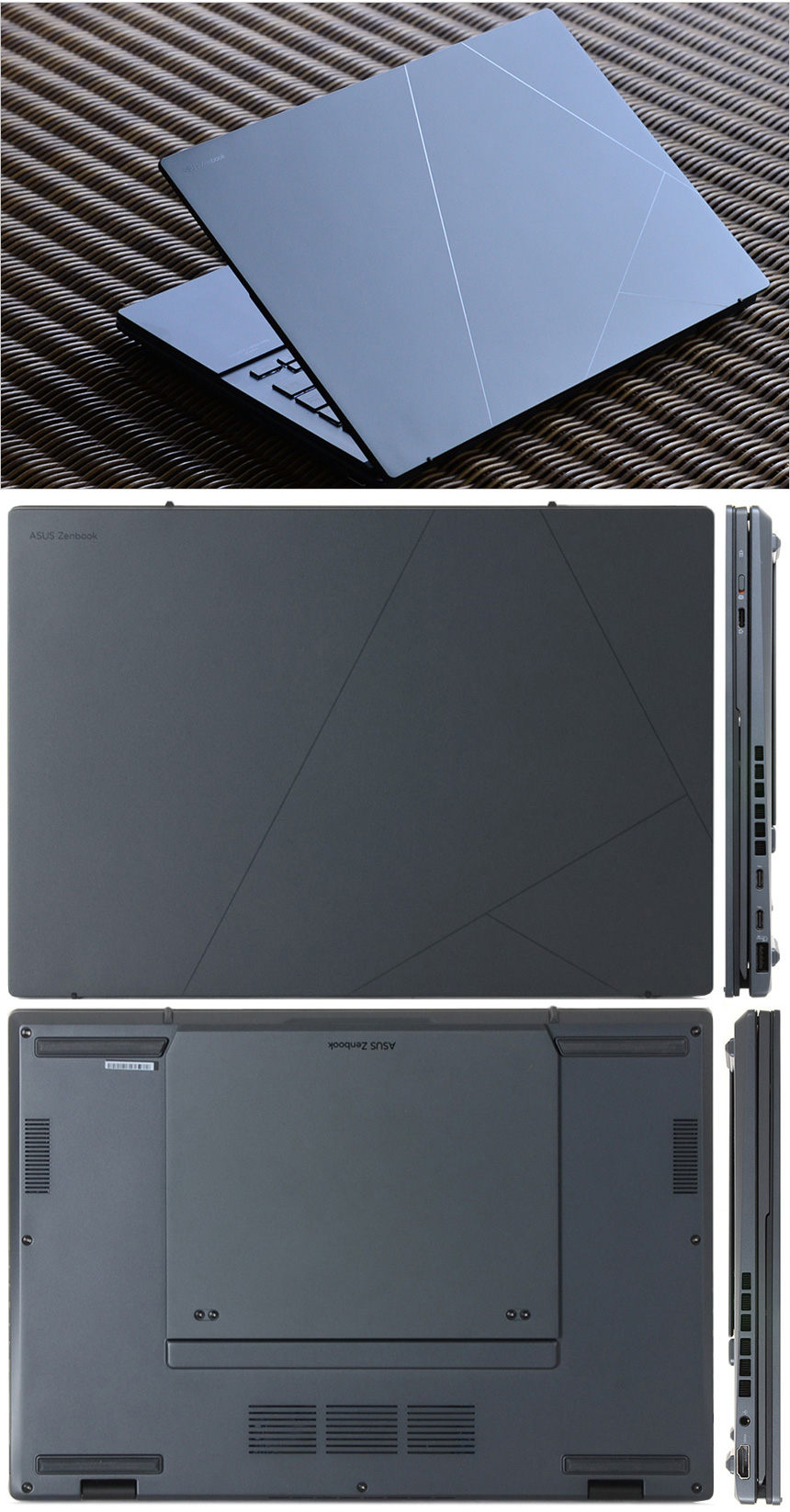 기기의 디자인은 프리미엄 모델답게 깔끔하고 고급스럽다. 보급형 노트북과 확연히 비교되는 높은 마감완성도를 보여주고 있으며 예술작품을 연상시키는 상판의 패턴도 인상적이다. 기존 젠북 시리즈와 같이 지문이나 먼지가 잘 묻어나지 않았으며 크리닝 천으로 이용해 쉽게 닦아낼 수 있었다.