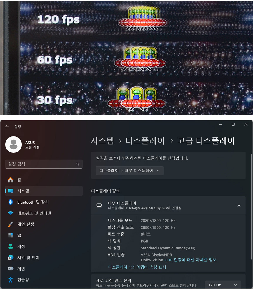 뿐만 아니라 60Hz 주사율을 지원하는 일반 노트북과 달리 이 제품은 120Hz 의 높은 주사율을 지원해 편하게 영상을 즐길 수 있다. 상단의 사진은 주사율에 따른 캐릭터 움직임을 카메라로 촬영한 모습으로 (셔터속도 1/20) 하위 프레임과 확연한 차이를 보여주고 있다. 참고로 최근 출시되는 스마트폰이 90Hz 나 120Hz를 지원하는 것은 특유의 부드러운 화면 전환 때문이다. (적응형 동기화를 지원해 상황에 따라 주사율을 자동으로 조절해 준다. 물론 수동 설정도 가능하다.)