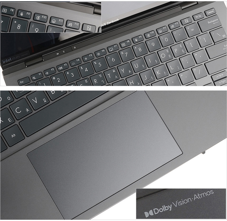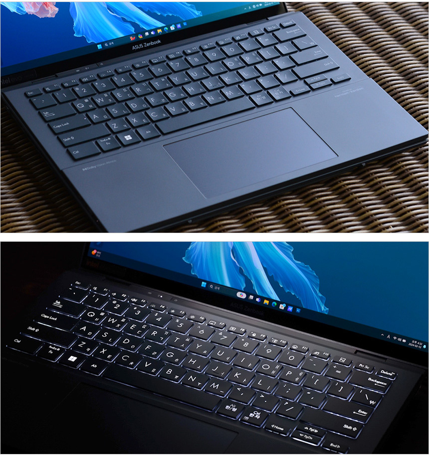 디스플레이의 모습으로 14형 크기에 WQXGA+ (2880 x 1800) 해상도를 지원한다. LCD 디스플레이를 사용하는 일반 노트북과 달리 ASUS Lumina OLED 패널을 탑재해 진하고 선명한 컬러를 즐길 수 있으며최대 500nits (HDR 적용시) 의 높은 밝기를 지원해 실내는 물론 야외에서도 높은 시인성을 경험할 수 있다. @ 참고로 2개의 디스플레이 스펙은 동일하다.