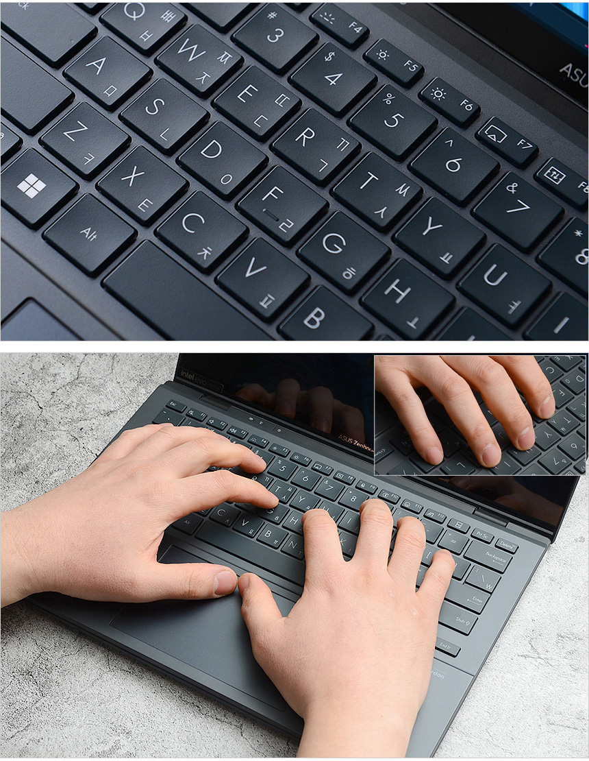 기본 제공되는 블루투스 키보드의 모습으로 텐키리스 디자인을 적용했으며 밝기 조절이 가능한 LED 백라이트를 지원해 어두운 야간에도 불편없이 노트북을 사용할 수 있다. 특히 이 제품은 19.05mm 의 키피치와 접시형 키캡, 1.4mm 의 긴 트래블 지원으로 타이핑 만족감을 높였으며 강의실이나 회의실, 사무실 등에서 주변 사람들에게 방해가 되지 않도록 저소음 키보드 기술을 적용했다.