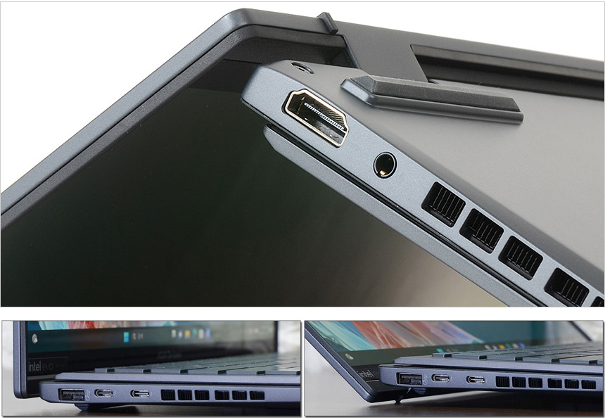 노트북 좌측면의 모습으로 주변기기 연결을 위한 A타입의 USB 3.2 단자가 설치되어 있고 하단에는 2개의 썬더볼트 4 단자와 통풍구가 설치된 것을 확인할 수 있다. 또한 키보드에는 충전용 C타입 단자를 비롯해 전원 스위치와 상태표시 LED가 장착되어 있다.