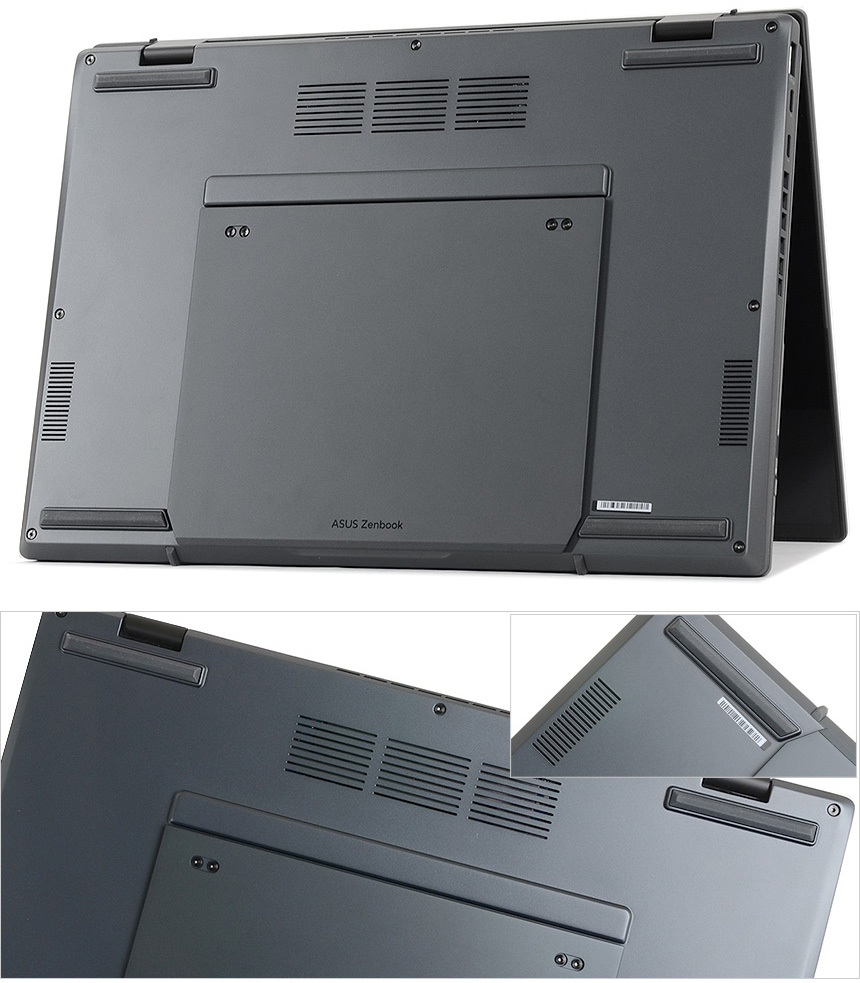 노트북 바닥면의 모습으로 상단에 통풍구가 설치되어 있고 사방에는 고무패드가 부착되어 충격을 흡수하고 미끄러짐을 방지한다. @ 전원설정을 균형조정 (밝기 50%, 에어플레인 모드, 저소음 모드, 싱글 모니터, 60Hz) 으로 설정해 슬라이드 쇼를 무한 반복해 본 결과 18시간 44분 재생 후 대기모드로 진입했으며 노트북이 꺼진 상태에서 1시간 동안 충전했을 때 82% 배터리 충전이 이루어진 것을 확인할 수 있었다. (긴 배터리 사용시간을 보여주었으며 충전속도도 대단히 빠른 것을 확인할 수 있었다.)