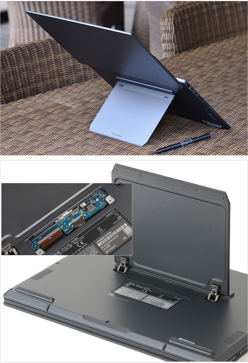 노트북 활용성을 극대화 하기 위해 스탠드가 장착되어 있다. (스탠드 사용법은 테스트 부분에서 확인할 예정이다.) 또한 배터리 전원을 분리할 수 있도록 구성된 것을 확인할 수 있다.