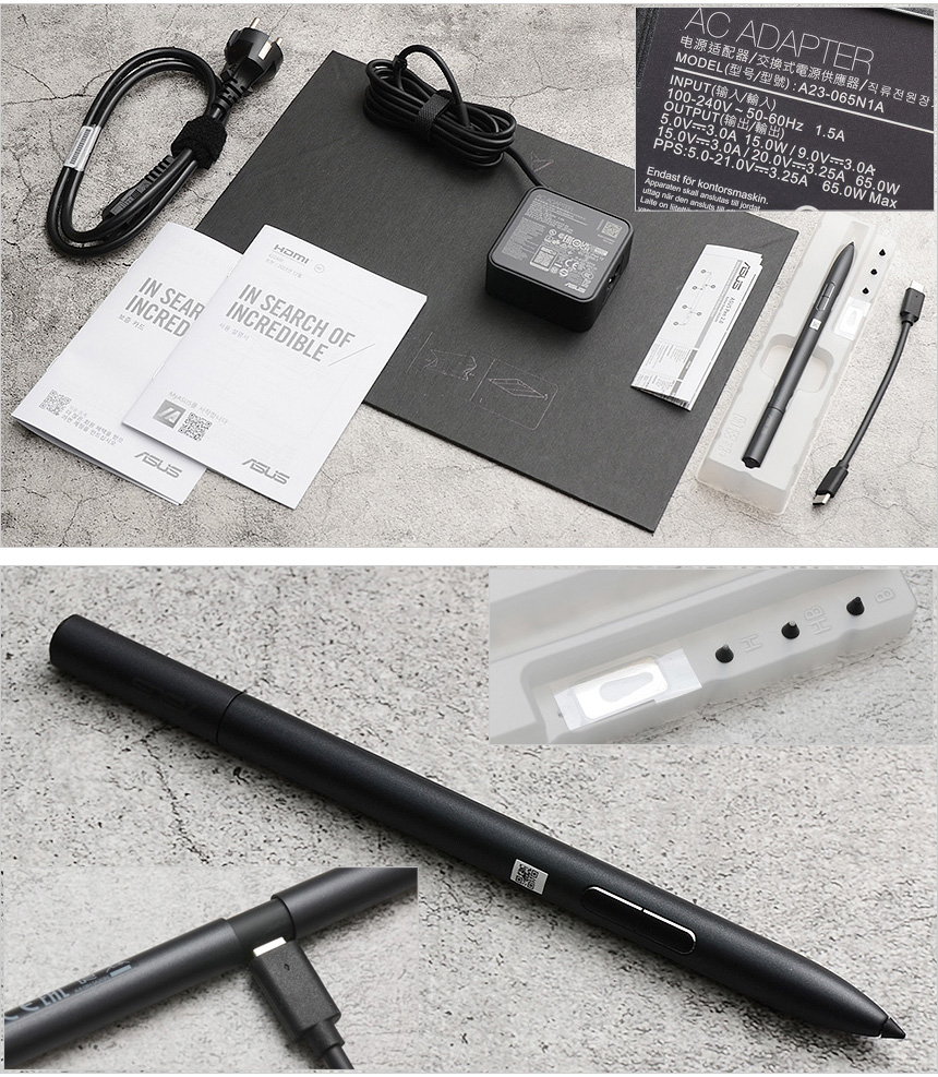 기본 제공되는 액세서리의 모습으로 65W 전원 어댑터와 전원 케이블을 비롯해 (다양한 전압 지원으로 스마트폰 충전용으로도 활용할 수 있다.) 종이 스탠드와 설명성 & 보증서, ASUS Pen 2.0 이 제공된다.