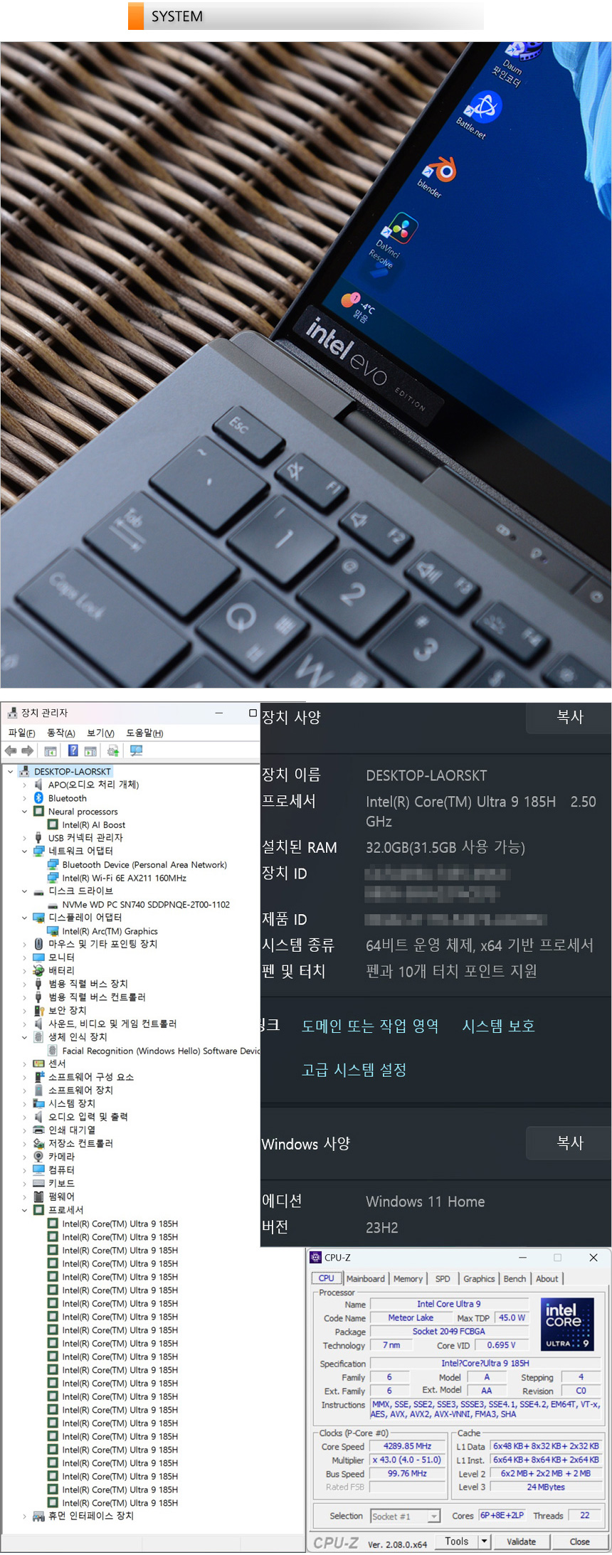 시스템 정보를 확인하고 있는 모습으로 6개의 성능코어와 8개의 효율코어, 2개의 초저전력 코어로 구성된 인텔코어 울트라 9 185H 프로세서가 장착된 것을 확인할 수 있다. 45W TDP에 24MB 캐시가 내장된 메테오레이크 최상급 프로세서로 강력한 성능을 구현한다.