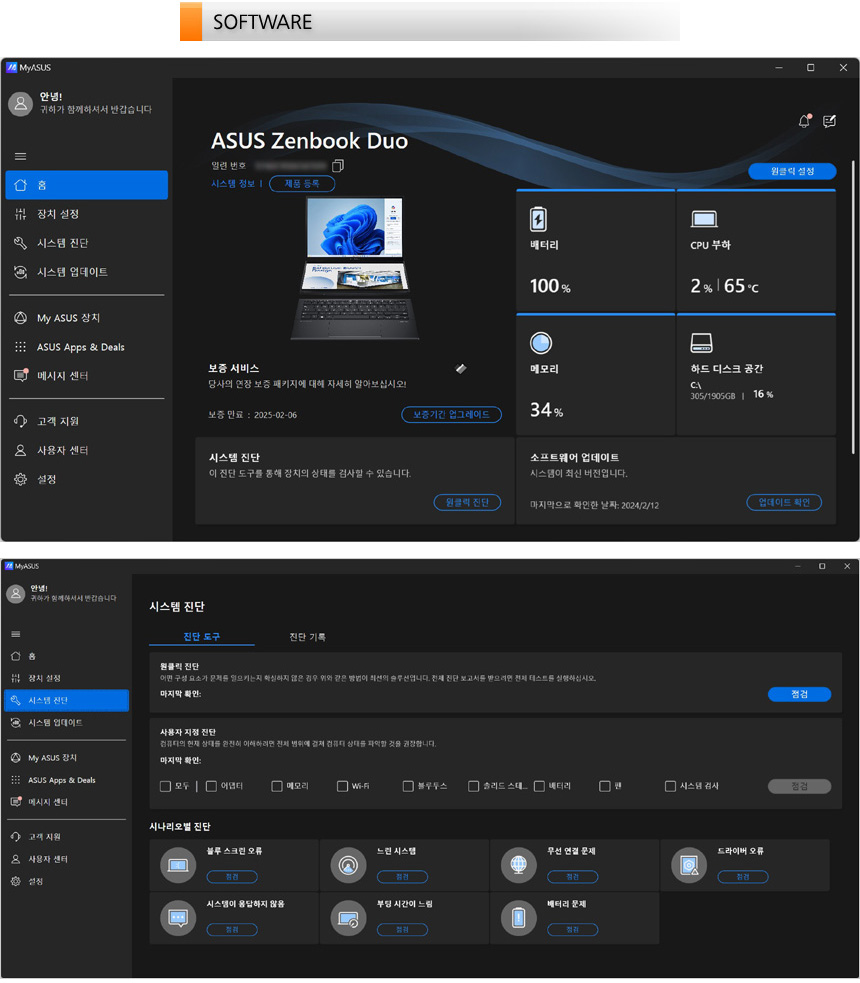 노트북을 사용자에 맞게 셋팅할 수 있는 MyASUS 앱을 실행한 모습으로 (키보드에서 핫키를 지원해 빠른 실행이 가능하다.) 업데이트를 지원해 최상의 컨디션을 유지할 수 있으며 원클릭 진단 기능을 지원해 시스템의 문제를 빠르게 파악할 수 있다. @ 세부 설정은 동영상을 통해 확인하기 바란다.