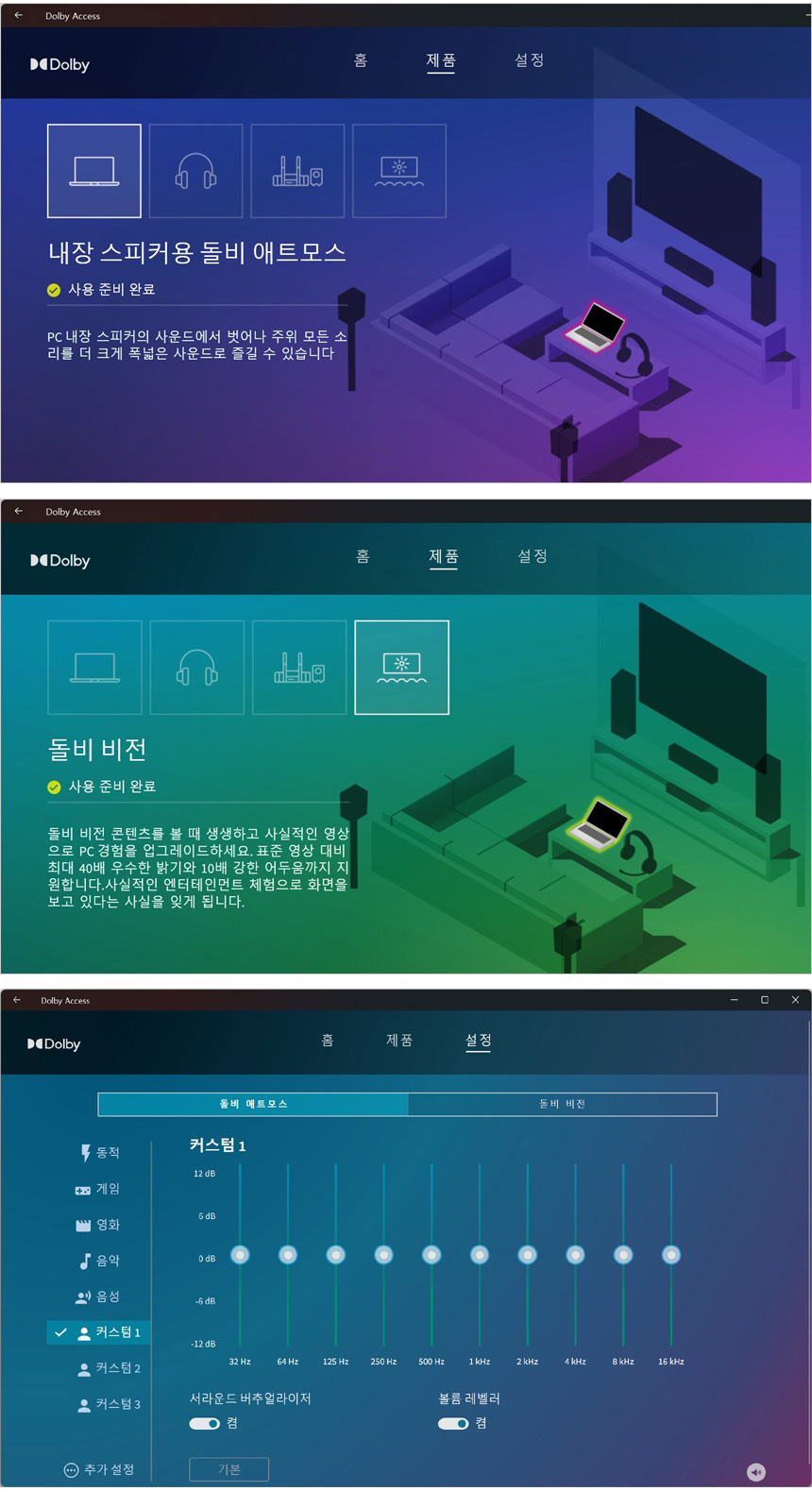 프리미엄 노트북 답게 돌비 비전과 애트모스를 모두 지원한다. 뛰어난 화질을 구현하며 입체감있는 사운드를 즐길 수 있다. (설정에서 EQ와 다양한 프로파일을 지원해 자신만의 음색을 설정할 수 있다.)