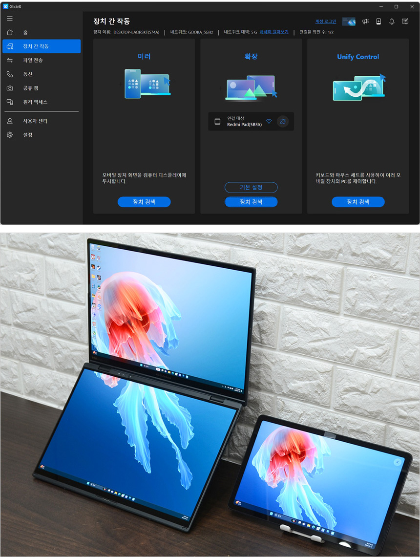 GlideX 앱을 지원해 화면의 복제나 확장, 유니파이 컨트롤이 가능하다. 상단의 사진은 확장 기능을 실행한 모습으로 태블릿 PC를 확장 모니터로 사용할 수 있었다. (참고로 미러를 선택하면 스마트폰 화면이 노트북에 표시된다.)