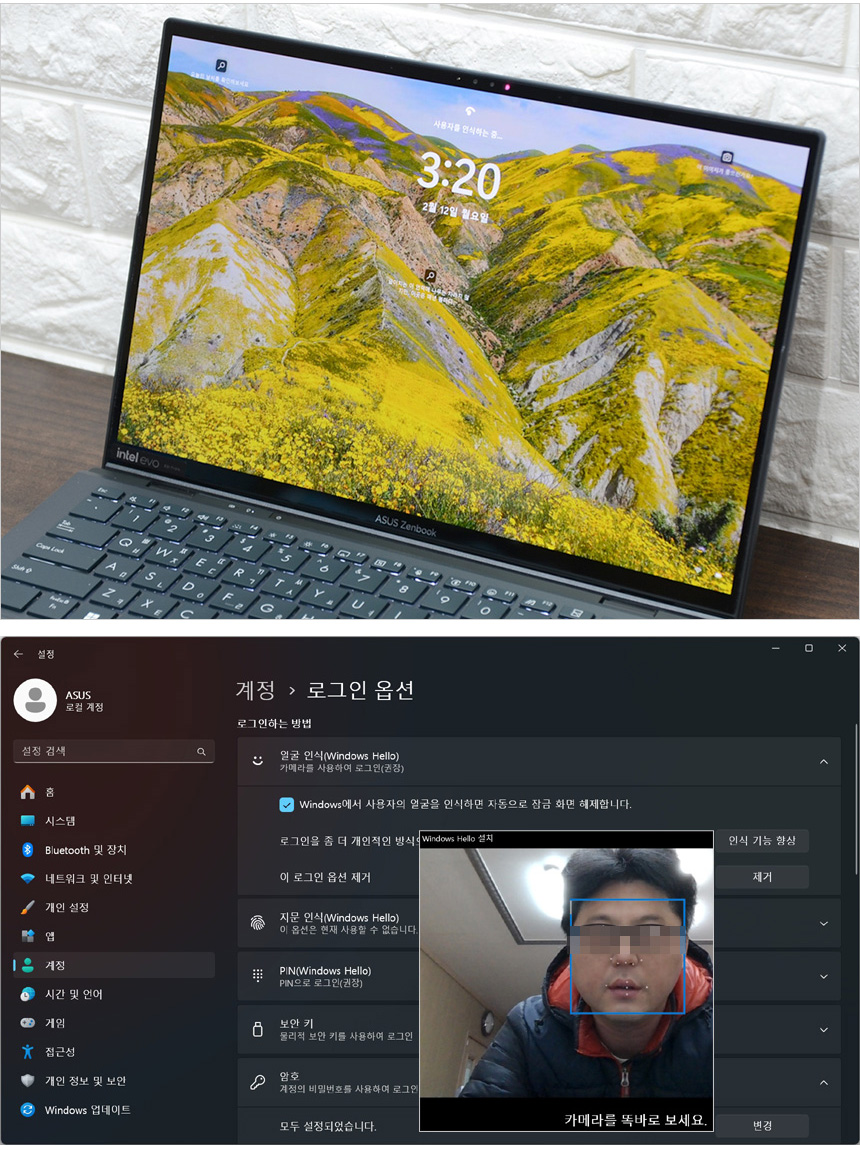 IR 카메라를 지원해 얼굴인식 로그인을 사용할 수 있다. 설정-계정에 있는 로그온 옵션에서 윈도우즈 헬로를 실행해 얼굴을 등록할 수 있으며 인식율도 뛰어나 편하게 사용할 수 있었다. (높은 보안성을 요구하는 비즈니스 노트북으로도 적합한 모델이다.)