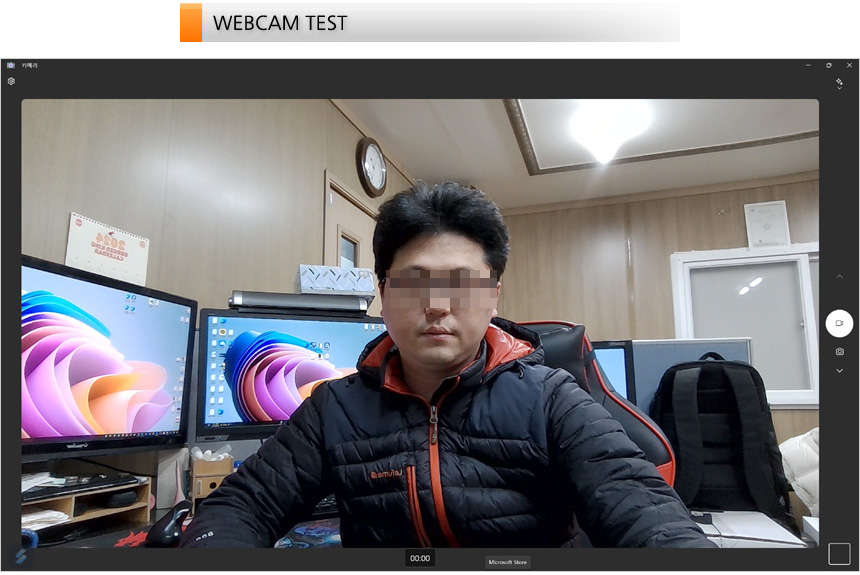 FHD 웹캠의 화질을 확인하고 있는 모습으로 보급형 노트북을 압도하는 선명함을 보여주었다. (입에서 탄성이 나올 정도로 선명도와 디테일이 뛰어났다.) AI 노이즈 캔슬링 까지 지원해 화상회의가 많은 재택근무자나 파견 및 출장이 잦은 직장인 들이 유용하게 사용할 수 있다.