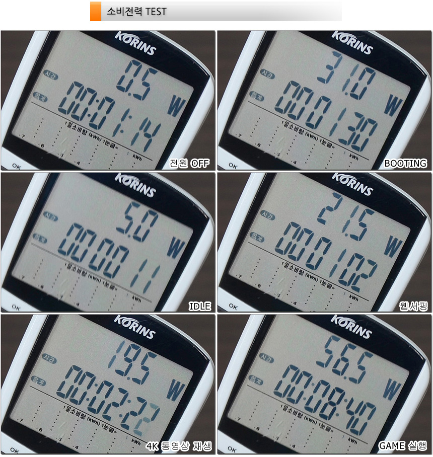 소비전력 테스트를 진행하고 있는 모습으로 (최고성능 모드, 듀얼 디스플레이) 캐주얼한 작업에서는 30W 이하의 낮은 전력으로 작동했으며 CPU가 최대 속도로 동작하는 게임에서는 50W 후반까지 소비전력이 올라가는 것을 확인할 수 있었다. (소비전력이 떨어지지 않고 50W대 에서 게임이 실행되었다.)