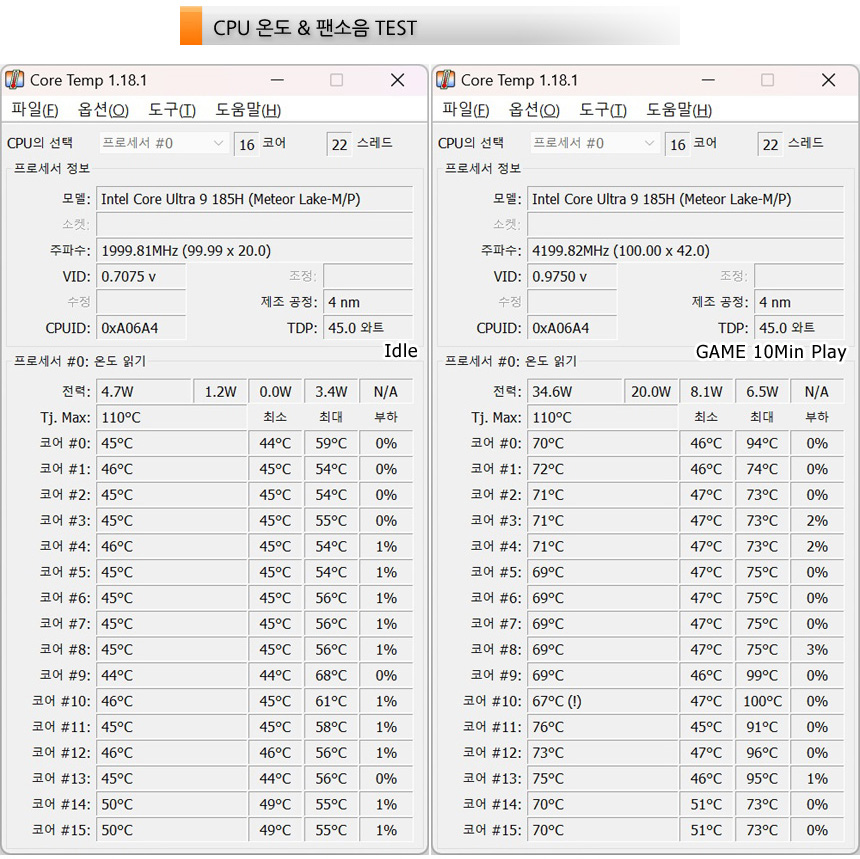 CPU 온도 테스트를 진행하고 있는 모습으로 (최고 성능 모드, 실내온도 14도) 아무것도 하지 않은 Idle 상태에서는 40도 중반으로 동작했으며 10분간 게임을 플레이 하고 측정했을 때 에 60~75도 사이에서 동작하는 것을 확인할 수 있었다. (순간적으로 90도 이상으로 올라가기도 했지만 대부분 70도 후반을 넘지 않았다.)