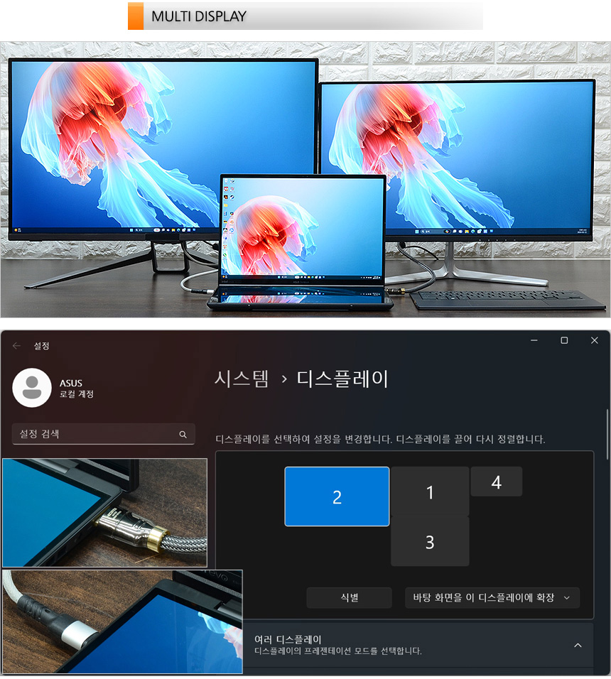 썬더볼트 4 단자가 디스플레이 출력을 지원해 HDMI를 포함한 2개의 모니터를 추가할 수 있다. 상단의 사진은 멀티 디스플레이 테스트를 진행하고 있는 모습으로 원할하게 작동하는 것을 확인할 수 있었다. 다중 모니터 사용이 필수적인 직장인 이나 대학생, 고해상도 모니터 사용이 필요한 전문가들이 유용하게 활용할 수 있을 것이다.